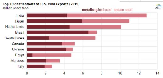 根據(jù)美國能源信息署的年度煤炭報告,2019年美國 煤炭出口下降至9300萬短噸,比上年下降20%。美國出口了冶金煤和動力煤,2019年兩者均下降。美國動力煤出口受全球煤炭需求下降的影響,較2018年下降了30%;冶金煤的跌幅較為溫和,為12%。