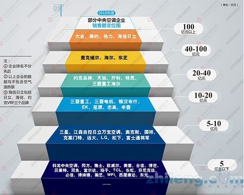 二、工程項目市場增長好于預(yù)期,超大項目、中小項目、樓盤配套齊頭并進(jìn)。與家裝零售市場的不景氣相比,工程項目市場在2018年度的表現(xiàn)卻要好于各企業(yè)的預(yù)期?梢哉f,正是由于工程項目市場好于預(yù)期的增長,才使得2018年度全國市場能夠繼續(xù)保持增長態(tài)勢。否則,一旦工程項目市場不景氣,整體市場有可能面臨下滑的風(fēng)險。在工程項目市場中,超大項目、中小項目和樓盤配套這三個細(xì)分市場的表現(xiàn)較為搶眼。機(jī)場、酒店、地鐵、會展中心等一批超大項目給予了各企業(yè)市場份額增長的空間,而中小項目的增長則為企業(yè)的增長奠定了基礎(chǔ),在家裝零售市場遭遇挑戰(zhàn)的情況下,樓盤配套市場幫助多聯(lián)機(jī)企業(yè)實現(xiàn)了在2018年度的增長。 三、產(chǎn)品市場表現(xiàn)各異,磁懸浮離心機(jī)、風(fēng)冷螺桿機(jī)組、模塊機(jī)組三大產(chǎn)品異軍突起。在2018年度整體市場實現(xiàn)個位數(shù)的增長過程中,產(chǎn)品市場的表現(xiàn)也各不相同。其中,離心機(jī)組市場雖然增長不多,但磁懸浮離心機(jī)卻得到了進(jìn)一步的發(fā)展。在2018年4月舉行的中國制冷展上,主流參展企業(yè)幾乎都帶來了磁懸浮離心機(jī)產(chǎn)品,同年10月,天加并購全球最大的磁懸浮(OFC)中央空調(diào)企業(yè)“SMARDT”,使這一市場更添熱度。由于數(shù)據(jù)中心等細(xì)分市場的火熱,使得風(fēng)冷螺桿機(jī)組成為2018年度冷水機(jī)組市場中增長最快的產(chǎn)品之一,部分企業(yè)風(fēng)冷螺桿機(jī)組的出貨金額甚至大于水冷螺桿機(jī)組。模塊機(jī)組則由于應(yīng)用廣泛以及“商用煤改電”的助力,在2018年度取得了快速的增長。與之相對的是,水冷螺桿機(jī)組、水地源熱泵機(jī)組等產(chǎn)品由于各種原因遭遇了整體市場的下滑。 四、數(shù)據(jù)中心、醫(yī)藥、軌道交通等細(xì)分行業(yè)繼續(xù)保持增長。2018年度,最為火熱的細(xì)分市場恐怕要數(shù)數(shù)據(jù)中心市場了,數(shù)據(jù)中心公司為部分企業(yè)集中處理數(shù)據(jù)業(yè)務(wù),成為2018年數(shù)據(jù)中心市場新的增長點(diǎn),這也直接導(dǎo)致了風(fēng)冷螺桿機(jī)組的市場增長。醫(yī)藥行業(yè)作為近幾年發(fā)展良好的市場在2018年持續(xù)火熱,越來越多的中央空調(diào)企業(yè)參加“藥機(jī)展”就是這一市場火熱的證明。軌道交通作為一項持續(xù)推進(jìn)的工程,在每年均有不少的項目數(shù)量,而在這一市場中更傾向于采用國產(chǎn)品牌的產(chǎn)品。此外,工業(yè)市場也是2018年表現(xiàn)較為搶眼的細(xì)分市場,一些專注于工業(yè)市場的中央空調(diào)企業(yè)在2018年度同樣取得了顯著的進(jìn)步。 五、部分企業(yè)開始實行多品牌運(yùn)作模式。2018年度,有多個企業(yè)開始實行雙品牌乃至三品牌的運(yùn)作模式。其中包括,海信日立公司運(yùn)作的日立、海信、約克VRF三個品牌,海爾中央空調(diào)運(yùn)作的海爾、卡薩帝雙品牌,美的中央空調(diào)運(yùn)作的美的、Clivet雙品牌等等,以及天加環(huán)境后續(xù)即將迎來的天加、SMARDT雙品牌。這是中央空調(diào)企業(yè)新的嘗試,在細(xì)分產(chǎn)品的同時,這些企業(yè)希望通過細(xì)分品牌,為用戶打造差異化的產(chǎn)品和服務(wù),從而尋求更高的市場空間,同時也給予渠道經(jīng)銷商更多的選擇。 基于以上的市場特點(diǎn),中央空調(diào)企業(yè)在2018年的表現(xiàn)也不盡相同。根據(jù)慣例,我們根據(jù)各個企業(yè)2018年度在中國市場的出貨額,對其進(jìn)行大致的陣營劃分。當(dāng)然,由于每年企業(yè)出貨額的不同,陣營的劃分標(biāo)準(zhǔn)也會有所變化。因此,在2018年度,大金、海信日立、美的、格力四個企業(yè)的出貨額均超過100億元而被列入第一陣營;第二陣營為40-100億元的企業(yè),2018年達(dá)到這一標(biāo)準(zhǔn)的企業(yè)為海爾、東芝、麥克維爾;第三陣營為20-40億元的企業(yè),2018年共計有天加、約克品牌、開利、特靈、三菱重工海爾等5個企業(yè);第四陣營為10-20億元的企業(yè),共有三菱重工、三菱電機(jī)、頓漢布什、EK、荏原、志高、申菱等7個企業(yè);第五陣營為5-10億元的企業(yè),共有三星、江森自控日立萬寶空調(diào)、奧克斯、國祥、克萊門特、遠(yuǎn)大、LG、松下、富士通將軍等9個企業(yè);第六陣營為5億元以下的企業(yè),在此就不一一列舉,我們僅列出部分品牌以供參考。(見圖3)