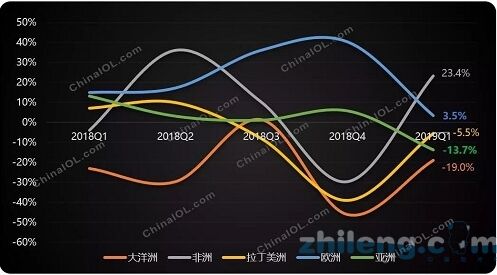 美的為了更快開辟國(guó)際市場(chǎng),搶占市場(chǎng)份額,與國(guó)內(nèi)市場(chǎng)的銷售策略一致,同步降低了出口價(jià)格。此外,美的利用其在海外完善的銷售渠道,自主品牌出口占比也有了提升。 TCL增長(zhǎng)有兩方面原因,一是采取集團(tuán)統(tǒng)一銷售的策略,TCL旗下有多媒體、手機(jī)、環(huán)境電器等多種產(chǎn)品,統(tǒng)一之后拓寬了銷售渠道;二是推出了一款體積更小、重量更輕的窗機(jī),在北美及歐洲很受歡迎,由此帶來(lái)了可觀的增長(zhǎng)。 海信在出口方面增長(zhǎng)最為亮眼,同比達(dá)到15.7%,并且在北美、拉美和亞洲均有不錯(cuò)的增長(zhǎng)。原因之一是得益于海信多產(chǎn)品、多渠道的協(xié)同作用,二是去年基數(shù)相對(duì)較小。 趨勢(shì):后續(xù)拐點(diǎn)已現(xiàn) 從分季度的各洲別出口增長(zhǎng)率情況來(lái)看,2019年一季度僅有非洲和歐洲有不同幅度的增長(zhǎng)。不過(guò)因?yàn)榉侵捱@幾年的出口表現(xiàn)一直不太穩(wěn)定,整體規(guī)模較高峰期出現(xiàn)較大萎縮,而且在全球市場(chǎng)中所占份額較小,不足以影響整體出口趨勢(shì)。歐洲這兩年一直保持了較高的增長(zhǎng),但今年一季度的市場(chǎng)增長(zhǎng)也出現(xiàn)疲軟,整體增速大幅收窄。 而主力需求區(qū)域亞洲的增長(zhǎng)率在步步走低。拉美地區(qū)的局勢(shì)也并不樂(lè)觀,整體降幅仍在雙位數(shù)以上。北美地區(qū)如前文所述,因?yàn)槊绹?guó)市場(chǎng)的提前透支出現(xiàn)雙位數(shù)下滑,從月度的趨勢(shì)來(lái)看也是如此,后續(xù)承壓顯著。