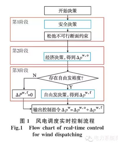 可以看出: ①當(dāng)電網(wǎng)無風(fēng)電接納空間內(nèi), 限制風(fēng)電出力, 確保安全; ②反之, 恢復(fù)風(fēng)電, 提高風(fēng)電利用率; ③并提供自由發(fā)模式, 減少由于風(fēng)電預(yù)測偏差導(dǎo)致的不必要棄風(fēng); ④電網(wǎng)優(yōu)先利用打分值較高對電網(wǎng)更加友好的風(fēng)電資源。 5、工作總結(jié)及進(jìn)一步工作: 本文提出并實現(xiàn)分階段風(fēng)電調(diào)度實時控制模型及決策流程。通過第一階段的斷面越限校正控制, 辨識并松弛不可能的風(fēng)電送出斷面約束, 通過第二階段的最小棄風(fēng)控制, 最大消納風(fēng)電并兼顧風(fēng)場間的公平調(diào)度, 通過第三階段的自由發(fā)決策, 進(jìn)一步降低棄風(fēng)可能,進(jìn)行標(biāo)準(zhǔn)算例仿真, 并結(jié)合現(xiàn)場實際, 研發(fā)1分鐘級的風(fēng)電調(diào)度實際控制功能。仿真結(jié)果和實際結(jié)果證明了本文方法的有效性和可靠性。 作為多時間尺度風(fēng)電消納框架的重要組成部分, 本文重點闡述在1分鐘級時間維度上風(fēng)電場之間、風(fēng)電場與常規(guī)AGC機(jī)組之間的協(xié)調(diào)控制。至于在更長時間尺度上考慮風(fēng)電場、AGC機(jī)組與常規(guī)較慢速機(jī)組之間的協(xié)調(diào), 充分挖掘電網(wǎng)和常規(guī)電源的調(diào)節(jié)能力, 使得電網(wǎng)保留足夠調(diào)節(jié)空間來接納風(fēng)電是后續(xù)研究重點。