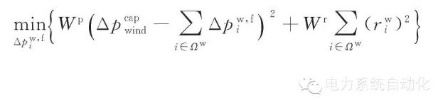 其中第1個目標(biāo)確保斷面運行安全, 第2個目標(biāo)確保風(fēng)電場公平調(diào)度; 約束條件主要包括:風(fēng)電場有功校正量對斷面有功變化的靈敏度約束、避免反調(diào)的風(fēng)電有功調(diào)節(jié)方向約束、風(fēng)電場有功出力約束、風(fēng)電送出斷面可行約束等。 4、第二階段決策—最小棄風(fēng)控制: 基于充分利用電網(wǎng)的風(fēng)電接納空間, 恢復(fù)被限風(fēng)電: