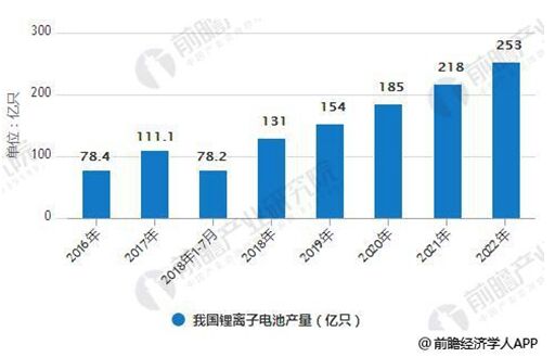 中國鋰離子電池產量分析預測 2016年,中國鋰離子電池產量僅為78.4億只,同比增長35.8%。到了2017年末,鋰離子電池產量達到111.1億只,同比增長31.3%。截止到2018年1-7月,鋰離子電池產量達到78.2億只,同比增長8.6%。預計2018年我國鋰離子電池產量將達到131億只,未來五年(2018-2022)年均復合增長率約為17.89%,預計到了2022年我國鋰離子電池產量將達到253億只。