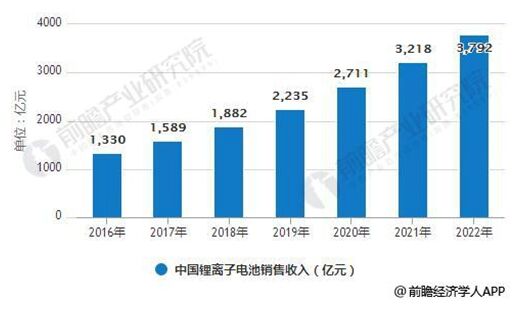 2016-2022年中國鋰離子電池銷售收入統(tǒng)計情況及預測
