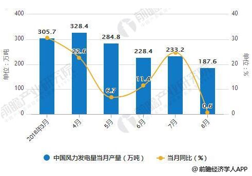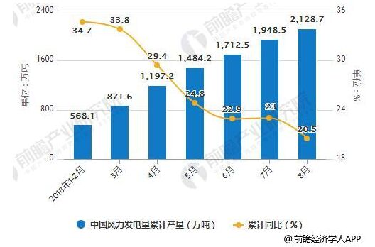 2018年1-8月中國風力發(fā)電量產量統(tǒng)計及增長情況