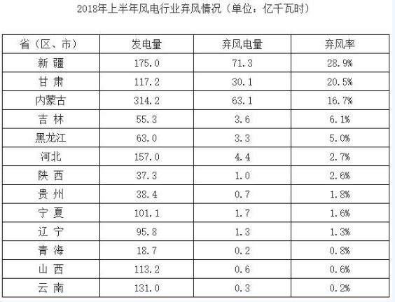 這說明,目前在中國火電還是占據(jù)了絕對的主導(dǎo)地位。而第二名的水電(發(fā)電量8326.2億千瓦時),前三季度增速只有4.4%,占比進(jìn)一步降到了16.53%。 “棄電”現(xiàn)象仍然嚴(yán)重 根據(jù)國家能源局?jǐn)?shù)據(jù),2018年上半年,全國棄風(fēng)電量182億千瓦時,同比減少53億千瓦時。風(fēng)電行業(yè)雖然棄風(fēng)電量有所下降,但情形依舊嚴(yán)峻,特別是新疆、甘肅、內(nèi)蒙古棄風(fēng)率排名前三。