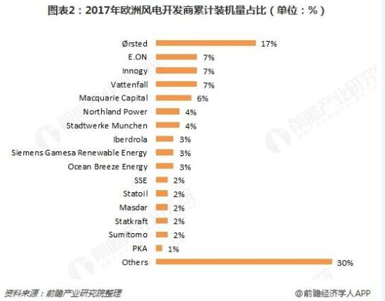 從企業(yè)角度來看,Ørsted是歐洲最大的海上風(fēng)電開發(fā)商,2017年底累計安裝量占?xì)W洲總裝機量的17%,比2016年略有增加。第二至第五名依次是E.ON(7%),德國能源巨頭Innogy(7%),Vattenfall(7%),Macquarie Capital(6%)。這排名前五的開發(fā)商總裝機量占?xì)W洲總額的44%,比2016年底略有減少。