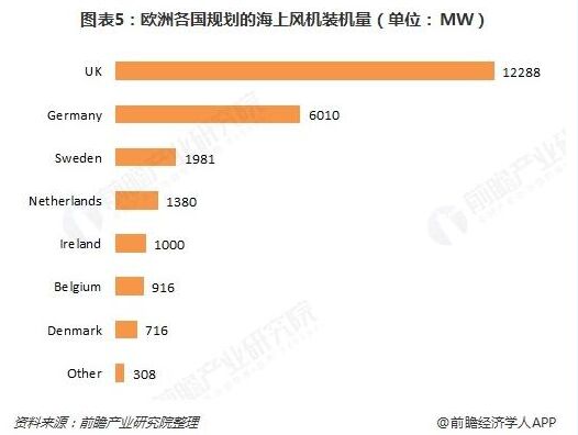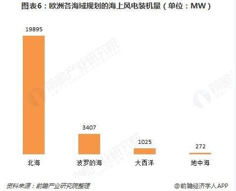 ——發(fā)電量 歐洲海上風(fēng)能發(fā)電量將隨著裝機容量的增長而提高,到2020年,海上風(fēng)力發(fā)電量將達(dá)到1482億千瓦小時,占?xì)W洲風(fēng)力發(fā)電量的四分之一,相當(dāng)于歐洲電力消費量的4%-4.2%。2030年,海上風(fēng)力發(fā)電量將達(dá)到5620億千瓦小時,占?xì)W洲風(fēng)力發(fā)電量的一半,相當(dāng)于歐洲電力消費量的13.9%。 ——區(qū)域分布 北海海域擁有豐富的海上風(fēng)能資源,將成為近期發(fā)展的重點區(qū)域,規(guī)劃的海上風(fēng)電裝機量比重約為19895MW。另外,一旦法國在大西洋的一些項目得到批準(zhǔn),大西洋的裝機量就會增加3GW。而地中海地區(qū)雖然一些項目已經(jīng)獲得批準(zhǔn),但是地中海區(qū)域裝機量在2020年之前并不會有明顯增長趨勢。