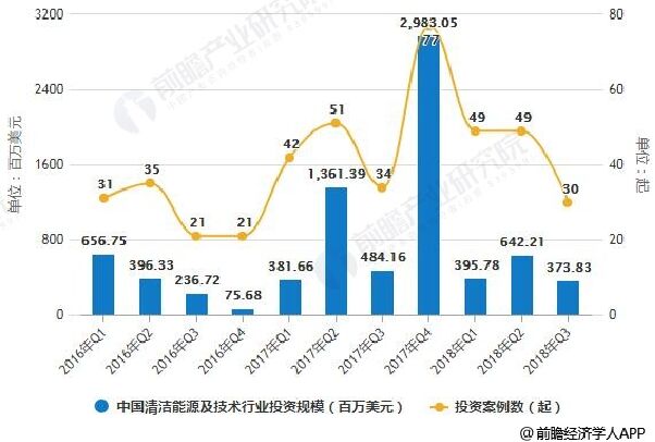 2016-2018Q3年中國清潔能源及技術(shù)行業(yè)投資規(guī)模統(tǒng)計及增長情況