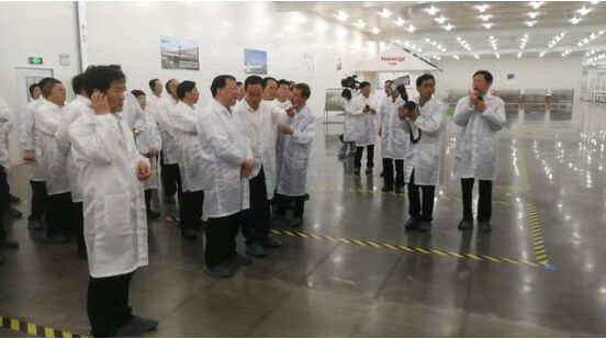 圖:龔正一行在李河君的陪同下考察漢能山東淄博基地