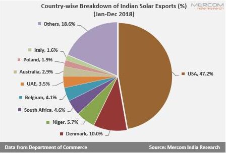 印度太陽能產(chǎn)品出口目的地 因此,印度在太陽能方面報復(fù)升級的范圍有限,因為美國對印度的太陽能出口可以忽略不計,2018年美國出口自印度的太陽能產(chǎn)品不足印度當年度進口量的1%。但是,那些依賴美國作為不斷增長的出口市場的制造商必須至少在其他地方尋找,直到保障稅率降低為止。