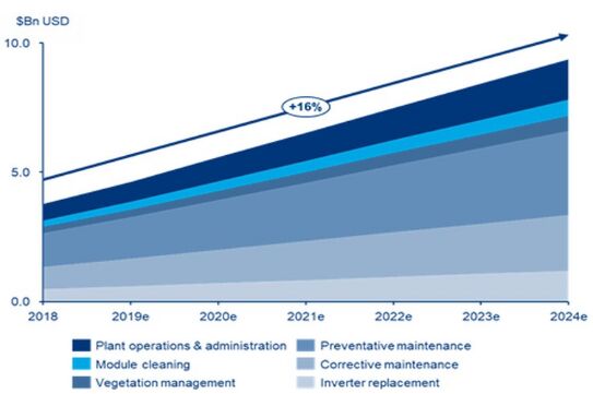 根據(jù)伍德·麥肯齊(Wood Mackenzie)的數(shù)據(jù),到2024年,太陽(yáng)能行業(yè)的年度運(yùn)營(yíng)和維護(hù)(O&M)成本將突破90億美元(82億歐元),高于2019年的約45億美元。
