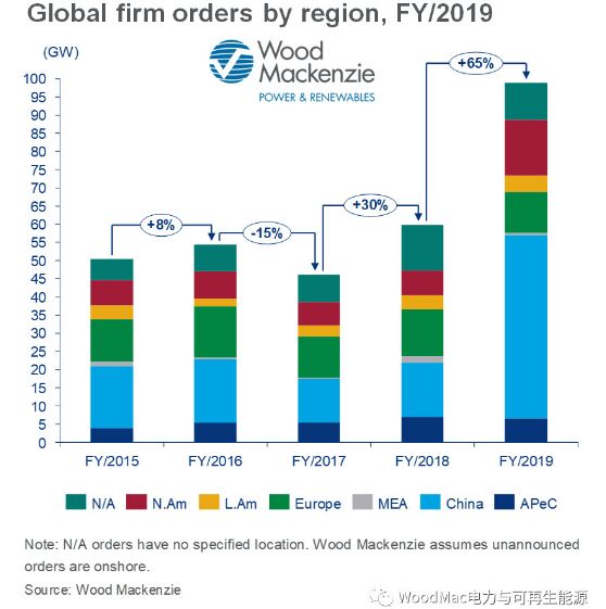 伍德麥肯茲(Wood Mackenzie)最新研究報告《全球風機訂單:2020年一季度》回顧了上一季度全球風機訂單容量統(tǒng)計情況及2019年全年度訂單分析。以下為英文報告的中文摘要。 據(jù)伍德麥肯茲統(tǒng)計,2019年全年度全球風機訂單容量將近100GW,合約780億美金交易。其中,四季度交易金額達到250億美金。整體訂單容量較2018年全年度訂單量提升39GW。