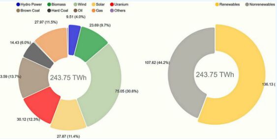 相比之下,去年同期可再生能源在德國的發(fā)電總量中所占比重為47%。 據(jù)了解,陸上和海上風(fēng)力發(fā)電現(xiàn)在是德國最大的能源電力來源,在2020年上半年占到75.05TWh,占全國發(fā)電量的30.6%,較去年同期增長了11.7%,由于冬季暴風(fēng)雪頻發(fā),2月份風(fēng)電在凈發(fā)電量中所占的比例甚至升至45%;受益于4~6月的晴好天氣,太陽能在德國可再生能源中排名第二,發(fā)電量比一年前增加了11.2%,并在2020年上半年達(dá)到德國凈發(fā)電量的11.4%;其次是生物質(zhì)發(fā)電,占德國發(fā)電量的9.7%,以及水力發(fā)電,占4%。 在此期間,除天然氣外,德國所有不可再生能源均出現(xiàn)下降。該國煤電占凈發(fā)電量的19%左右,核能占12.3%,天然氣的市場份額達(dá)到了11.5%。 據(jù)悉,德國全社會用電量從1月份的47.9TWh下降到6月份的36.0TWh,預(yù)計(jì)全年總用電量為234.2TWh,這個數(shù)字與2019年上半年的245.7太瓦時(shí)相比,將存在顯著下降。
