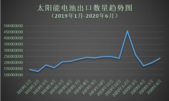 據(jù)海關(guān)數(shù)據(jù)顯示,2020年6月中國太陽能電池出口數(shù)量為2.3億個(gè),同比增長11.37%;1-6月太陽能電池累計(jì)出口數(shù)量為13.2億個(gè),較去年同期增長29.64%。2020年6月中國太陽能電池出口金額為15.3億美元,同比下跌4.42%;1-6太陽能電池累計(jì)出口金額88.5億美元,較去年同期下跌7.59%。 從2020年上半年出口數(shù)據(jù)上看,我國太陽能電池整體出口量持續(xù)增長。其中,1-3月出口量較為穩(wěn)定,4-5月受海外疫情影響,出口量表現(xiàn)低迷,6月隨著全球大部分國家復(fù)工復(fù)產(chǎn),出口數(shù)據(jù)獲得上漲,出口形勢逐漸好轉(zhuǎn)。與此同時(shí),太陽能電池出口金額卻呈現(xiàn)出下降趨勢,反映出我國太陽能電池出口價(jià)格持續(xù)下降。