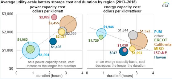 根據(jù)美國能源信息署的數(shù)據(jù),美國公用事業(yè)規(guī)模電池存儲的平均能量容量成本已從2015年的2152美元/千瓦時迅速降至2018年的625美元/千瓦時。截至2018年底,美國的電池裝機功率容量為869兆瓦(電池在給定時刻所能提供的最大功率),電池能量容量為1236兆瓦時(電池可儲能的總能量)。