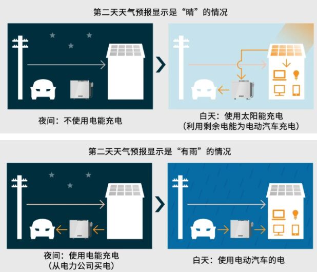 V2H-充放電器作為能源管理可單獨使用,但通過與HEMS結合,便可以使用更多功能,比如天氣預報功能,晴天時,光伏發(fā)電既能滿足家庭內部的電力,同時給電動汽車充電。如果是陰雨天,則可在電價低的夜間進行充電以應對白天的用電需求。