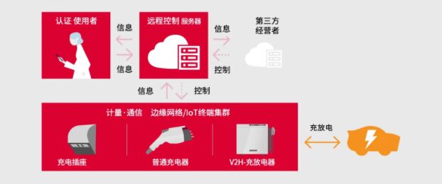 隨著可再生能源逐漸成為社會共識,VPP(虛擬發(fā)電廠)系統(tǒng)逐步發(fā)揮更大作用。電動汽車的充放電服務對VPP(虛擬發(fā)電廠)而言也是不可或缺的重要組成。集中管理的充放電服務主要分為兩個要素,一個是邊緣側,正在開發(fā)與電裝的V2H-充放電器等連接的IoT物聯(lián)網(wǎng)終端,該終端將具備電力計算和遠程控制的功能。另一個是服務器端,將來自多個終端的信息進行匯總和分析,并為每個充放電器發(fā)出恰當?shù)某潆姾头烹娭噶睢?nbsp;