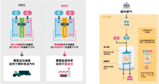 根據(jù)使用的電解質(zhì)和工作溫度進行燃料電池的類型劃分。FCEV(燃料電池汽車)中所使用的燃料電池稱為PEFC,PEFC使用高分子隔膜作為電解質(zhì)膜。高分子隔膜在約100°C下反應(yīng),其特點是啟動時間短。SOFC使用的是陶瓷隔膜,其反應(yīng)溫度可高達700℃。由于溫度高,啟動時間比PEFC長,但同時也具備能源效率高的特點, 因此更適用于固定裝載模式。