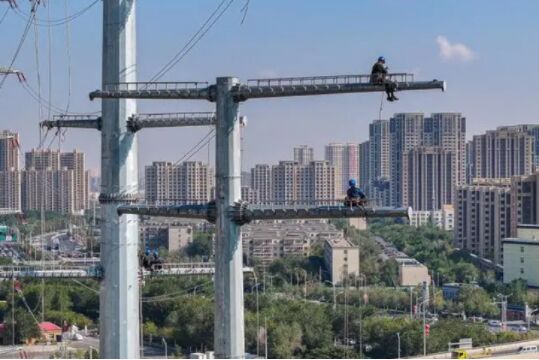烏魯木齊一處電力施工現(xiàn)場,工人正在鐵塔上架設(shè)導(dǎo)線。(劉元寶 攝)
