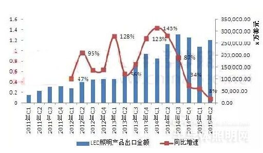 CSA Research對海關(guān)出口數(shù)據(jù)整理可得2015年第1季度上半年出口總額為25.450億美元,較2014年第4季度上半年增加7億美元,同比增加16%。實際上,從2011年至2014年,在我國整體外貿(mào)出口逐漸萎縮的狀況,LED照明產(chǎn)品出口一枝獨秀,一直保持超過30%的超高速增長。 2014至2015年我國LED照明產(chǎn)品的出口增速較2011年至2013年來有所緩和,從2011年1季度的3.4億美元到2014年第1季度的27.64億美元,出口總額幾乎翻了3番。但自2014年第2季度開始,出口增速開始呈現(xiàn)懸崖式下滑, 2015年第2季度,出口總額達到26億美元,出口增速為8%。