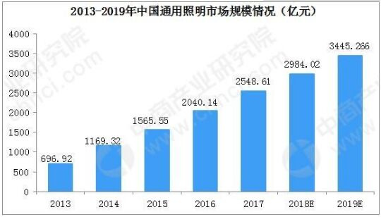 近年來(lái),在全球大力推廣LED照明的背景下,世界主要國(guó)家相繼出臺(tái)淘汰白熾燈計(jì)劃,推動(dòng)了LED照明產(chǎn)品對(duì)白熾燈、熒光燈等傳統(tǒng)照明產(chǎn)品的加速替代。 世界各國(guó)和地區(qū)淘汰白熾燈計(jì)劃經(jīng)過(guò)多年的市場(chǎng)培育和技術(shù)投入,目前全球通用照明產(chǎn)業(yè)已呈現(xiàn)爆發(fā)式增長(zhǎng)趨勢(shì)。在世界各國(guó)和地區(qū)節(jié)能、減排、環(huán)保等政策推廣支持下,2016年全球通用照明產(chǎn)品滲透率達(dá)31.30%。我國(guó)國(guó)內(nèi)照明市場(chǎng)方面,近年來(lái)通用照明是我國(guó)照明產(chǎn)業(yè)發(fā)展最快的領(lǐng)域。 2013-2017年,我國(guó)通用照明市場(chǎng)規(guī)模從約697億元增長(zhǎng)至2549億元,此期間市場(chǎng)規(guī)模年復(fù)合增長(zhǎng)率達(dá)45%。2019年市場(chǎng)規(guī)模將達(dá)到3445億元。
