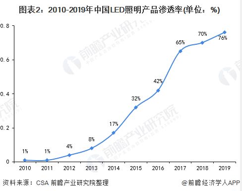 照明產(chǎn)品是國民經(jīng)濟(jì)發(fā)展和人民生活的必需品,照明行業(yè)在國民經(jīng)濟(jì)中具有特殊的地位和作用。照明從基于鎢絲燈,氣體放電燈的傳統(tǒng)照明跨入基于半導(dǎo)體器件的LED照明,正好遇到移動(dòng)互聯(lián)網(wǎng)躍進(jìn)到萬物互聯(lián)的物聯(lián)網(wǎng)IoT的時(shí)代風(fēng)口,兩者的結(jié)合,開創(chuàng)了前景廣闊的基于物聯(lián)網(wǎng)的智能照明時(shí)代。 平穩(wěn)發(fā)展的LED照明行業(yè)為智能照明打下基礎(chǔ) LED照明技術(shù)是智能照明的基礎(chǔ)。LED燈具有其他燈具無可比擬的優(yōu)點(diǎn)如體積小、高亮度低熱量、環(huán)保、可控性強(qiáng)等,目前正廣泛應(yīng)用在各照明領(lǐng)域中。2011年11月14日,國家發(fā)改委等五部委發(fā)布了“中國逐步淘汰白熾燈路線圖”,計(jì)劃從2016年10月1日開始,禁止進(jìn)口和銷售15瓦及以上普通照明白熾燈。同時(shí),LED照明產(chǎn)品成本不斷下降,其正在逐步替代傳統(tǒng)照明產(chǎn)品,成為家居、商業(yè)、工業(yè)、戶外照明的主力。2019年,中國LED照明市場規(guī)模達(dá)到6823億元,LED照明產(chǎn)品滲透率達(dá)到76%。