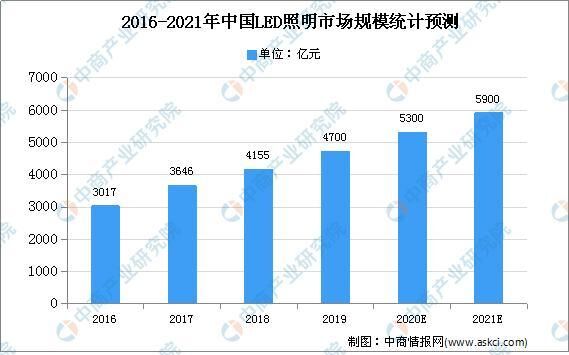 從市場(chǎng)規(guī)模來(lái)看,隨著國(guó)內(nèi)LED照明市場(chǎng)滲透率快速攀升至七成以上,LED照明已基本成為照明應(yīng)用的剛需,國(guó)內(nèi)的LED照明市場(chǎng)規(guī)模呈現(xiàn)出較全球平均水平更快的增長(zhǎng)勢(shì)頭。數(shù)據(jù)顯示,中國(guó)LED照明市場(chǎng)產(chǎn)值規(guī)模由2015年的2596億元增長(zhǎng)到2018年的4155億元,年均復(fù)合增長(zhǎng)率達(dá)到16.97%,增速高于全球平均水平。預(yù)計(jì)到2021年,中國(guó)LED照明市場(chǎng)產(chǎn)值有望達(dá)到5900億元,2019-2021年仍有望能保持超過(guò)12%的年均復(fù)合增長(zhǎng)水平。
