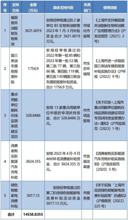 上海市2023年節(jié)能減排專項(xiàng)資金安排計(jì)劃(第二批)發(fā)布啦!支持方向?yàn)?span style="font-weight: bold;">餐廚廢棄油脂制生物柴油、國(guó)三柴油車提前報(bào)廢補(bǔ)貼、重點(diǎn)用能單位能耗在線監(jiān)測(cè)系統(tǒng)建設(shè)項(xiàng)目、消費(fèi)者購(gòu)買新能源汽車充電補(bǔ)助、綠色智能家電消費(fèi)補(bǔ)貼等5項(xiàng)工作,計(jì)劃下達(dá)節(jié)能減排專項(xiàng)資金14558.8355萬(wàn)元,詳見(jiàn)↓