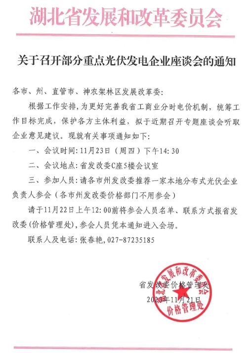 11月21日,湖北省發(fā)改委價格管理處發(fā)布《關(guān)于召開部分重點光伏發(fā)電企業(yè)座談會的通知》,為更好完善湖北省工商業(yè)分時電價機制,統(tǒng)籌工作目標(biāo)完成,保護(hù)各方主體利益,湖北省發(fā)改委擬于11月23日召開專題座談會聽取企業(yè)意見建議。 通知如下: