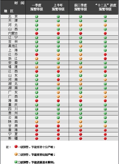 為督促各地做好節(jié)能工作,我們建立模型對各地區(qū)前三季度單位GDP能耗變化情況進(jìn)行了預(yù)測,并與各地區(qū)年度及“十二五”節(jié)能目標(biāo)任務(wù)進(jìn)行了比較分析,確定了各地預(yù)警等級,制作了各地區(qū)節(jié)能目標(biāo)完成情況晴雨表。 通過分析,內(nèi)蒙古、海南、青海、寧夏、新疆等5地區(qū)預(yù)警等級為一級,河北、黑龍江、江蘇、浙江、福建、江西、河南、湖北、廣西、陜西、甘肅等11個地區(qū)預(yù)警等級為二級,北京、天津、山西、遼寧、吉林、上海、安徽、山東、湖南、廣東、重慶、四川、貴州、云南等14個地區(qū)預(yù)警等級為三級。西藏缺乏統(tǒng)計數(shù)據(jù),沒有進(jìn)行預(yù)測。與上半年預(yù)測相比,有1個地區(qū)預(yù)警等級提高,黑龍江由三級預(yù)警轉(zhuǎn)為二級預(yù)警,節(jié)能形勢趨于嚴(yán)峻;有4個地區(qū)預(yù)警等級下降,江西、河南、甘肅由一級預(yù)警轉(zhuǎn)為二級預(yù)警,廣東由二級預(yù)警轉(zhuǎn)為三級預(yù)警。 與“十二五”節(jié)能工作進(jìn)度要求相比較,內(nèi)蒙古、江蘇、浙江、江西、海南、青海、寧夏、新疆等地區(qū)預(yù)警等級為一級,河北、河南、廣東、廣西、甘肅等地區(qū)預(yù)警等級為二級,北京、天津、山西、遼寧、吉林、黑龍江、上海、安徽、福建、山東、湖北、湖南、重慶、四川、貴州、云南、陜西等地區(qū)預(yù)警等級為三級;與上半年預(yù)測相比,5個地區(qū)預(yù)警等級下降,福建、湖北、陜西由二級預(yù)警轉(zhuǎn)為三級預(yù)警,河南、甘肅由一級預(yù)警轉(zhuǎn)為二級預(yù)警。 現(xiàn)將晴雨表印發(fā),供各地區(qū)在工作中參考。 各地區(qū)2011年前三季度節(jié)能目標(biāo)完成情況晴雨表