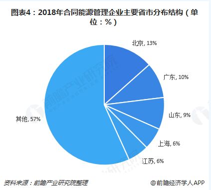 四、企業(yè)地域競爭格局 節(jié)能市場的快速發(fā)展使節(jié)能服務(wù)行業(yè)受到越來越多的關(guān)注,行業(yè)中的參與者也迅速增加,我國超過80%的節(jié)能服務(wù)公司是在“十二五”期間成立或轉(zhuǎn)型開展節(jié)能服務(wù)業(yè)務(wù),據(jù)中國節(jié)能協(xié)會節(jié)能服務(wù)產(chǎn)業(yè)委員會(EMCA)發(fā)布數(shù)據(jù)顯示,截至2017年年底,全國從事節(jié)能服務(wù)的企業(yè)為6137家,節(jié)能行業(yè)從業(yè)人員總數(shù)已達(dá)68.5萬。 從企業(yè)地域分布情況來看,北京、廣東、山東、上海、江蘇分別占據(jù)了前五位,分別為824家,591家,527家,362家和348家,占總體的比例43.2%,可以看出節(jié)能服務(wù)行業(yè)市場規(guī)模不斷增長,區(qū)域發(fā)展不均衡。由于東西部在技術(shù)、資金、人才上存在差異,行業(yè)內(nèi)企業(yè)布局不合理,東西部發(fā)展差距明顯。
