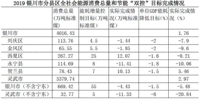 按照自治區(qū)年度考核5+1模式(寧東能耗等分項(xiàng)指標(biāo)單列),扣除寧東,銀川市全社會(huì)能源消費(fèi)量669.42萬(wàn)噸標(biāo)準(zhǔn)煤,同比下降0.66%,單位GDP能耗同比下降5.48%,年度消費(fèi)量增量為減少4.43萬(wàn)噸標(biāo)準(zhǔn)煤,超額完成了2019年銀川市(扣除寧東)單位GDP能耗下降1.5%,能源消費(fèi)增量控制在55萬(wàn)噸標(biāo)準(zhǔn)煤以內(nèi)的節(jié)能“雙控”目標(biāo)任務(wù)。 從分縣區(qū)2019年節(jié)能“雙控”目標(biāo)的完成情況看,賀蘭縣增量控制目標(biāo)和單位GDP能耗下降目標(biāo)均未完成,西夏區(qū)完成了增量控制目標(biāo),但未完成單位GDP能耗的下降目標(biāo),其它縣(市)區(qū)均較好的完成當(dāng)年的節(jié)能“雙控”目標(biāo)。