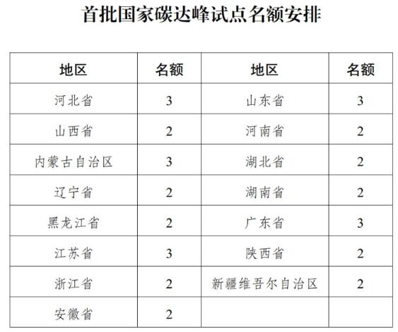 統(tǒng)籌考慮各地區(qū)碳排放總量及增長趨勢、經(jīng)濟(jì)社會(huì)發(fā)展情況等因素,首批選取15個(gè)省區(qū)按照名額分配,建設(shè)35個(gè)碳達(dá)峰試點(diǎn)城市和試點(diǎn)園區(qū),具體名單由有關(guān)省區(qū)發(fā)展改革委提出,經(jīng)本地區(qū)人民政府同意后,于2023年11月15日前報(bào)國家發(fā)展改革委確認(rèn)。這15個(gè)省區(qū)從地域地理分布來看,有華北、華中、華東、西北、東北、東南,從沿海到內(nèi)陸,覆蓋了全國東西南北中各個(gè)方位;從區(qū)域經(jīng)濟(jì)結(jié)構(gòu)來看,既包擴(kuò)山東、江蘇、廣東等經(jīng)濟(jì)大省,也包括遼寧、河北、黑龍江等制造業(yè)占主導(dǎo)產(chǎn)業(yè)的省份,還包括山西、內(nèi)蒙古和新疆等傳統(tǒng)能源和新能源富集地區(qū)?梢钥闯觯歼_(dá)峰試點(diǎn)地區(qū)的分配無論是從地理分布、產(chǎn)業(yè)布局還是能源結(jié)構(gòu),都統(tǒng)觀全局,兼顧均衡發(fā)展。
