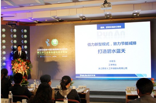 本屆峰會(huì)的主題為“第三次工業(yè)革命重構(gòu)清潔發(fā)展”,從“第三次工業(yè)革命”的背景出發(fā),前瞻國(guó)家政策,分析清潔發(fā)展圖景,交流企業(yè)應(yīng)對(duì)戰(zhàn)略。盾安環(huán)境“環(huán)境優(yōu)化與系統(tǒng)集成”事業(yè)部總經(jīng)理助理徐敬玉在會(huì)上做了《借力新型模式,致力節(jié)能減排,打造碧水藍(lán)天》的主題演講。盾安環(huán)境始終堅(jiān)持“低碳節(jié)能、綠色發(fā)展”的理念,全面實(shí)施產(chǎn)業(yè)轉(zhuǎn)型升級(jí),實(shí)現(xiàn)由傳統(tǒng)產(chǎn)品制造商向系統(tǒng)集成服務(wù)商的華麗轉(zhuǎn)身。2011年在天津設(shè)立盾安節(jié)能產(chǎn)業(yè)總部后,瞄準(zhǔn)工業(yè)余熱、城市污水及可再生能源銳意開拓,通過創(chuàng)新的商業(yè)模式、專業(yè)化的節(jié)能技術(shù)助力城市節(jié)能減排,不僅獲得各地政府與能耗企業(yè)的歡迎與好評(píng),屢獲大單,確立了盾安節(jié)能在節(jié)能服務(wù)行業(yè)的領(lǐng)軍地位,還實(shí)現(xiàn)了工業(yè)企業(yè)、地方政府、社會(huì)大眾與盾安的多方共贏局面。