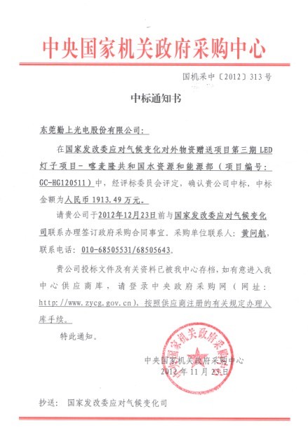 近日,勤上光電收到了由中央國家機關政府采購中心發(fā)出的《中標通知書》(國機采中[2012]313號),確定為國家發(fā)改委應對氣候變化對外物資贈送項目第三期LED燈子項目喀麥隆共和國水資源和能源部的中標人,中標金額為1913.49萬元。