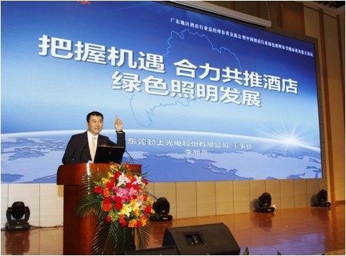 2013年3月16日,由國(guó)際酒店領(lǐng)袖機(jī)構(gòu)主辦,勤上光電承辦的廣東地區(qū)酒店行業(yè)總經(jīng)理春茗交流會(huì)暨中國(guó)酒店行業(yè)綠色照明及節(jié)能標(biāo)準(zhǔn)化建立論壇在東莞召開,來(lái)自國(guó)家標(biāo)準(zhǔn)化協(xié)會(huì)專家、照明設(shè)計(jì)專家、酒店業(yè)主等120人參加。論壇上,行業(yè)協(xié)會(huì)及聯(lián)盟組織發(fā)起《中國(guó)綠色酒店照明技術(shù)規(guī)范制定》啟動(dòng)儀式,勤上光電受邀參加該規(guī)范的制定。