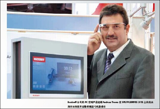 去年在德國紐倫堡舉辦的“2013 年德國紐倫堡工業(yè)自動化及元件展覽會(SPS/IPC/DRIVES 2013)上,Beckhoff 展出了通過專注于谷歌眼鏡的技術(shù)研究開發(fā)而成的針對機械操作的最新解決方案。有了具有上網(wǎng)功能的谷歌眼鏡,狀態(tài)或?qū)υ捪⒖梢酝ㄟ^一個頭戴式顯示器直接投射到人眼中。在線信息和通信也可以用這種創(chuàng)新的設(shè)備實現(xiàn),且錯誤信息可以使用觸摸板進行確認。Beckhoff 公司的 PC 控制產(chǎn)品經(jīng)理 Andreas Thome 堅定地認為,谷歌眼鏡是互聯(lián)網(wǎng)和自動化技術(shù)相融合推動工業(yè) 4.0 發(fā)展的最突出的例子。 Beckhoff 公司的 PC 控制產(chǎn)品經(jīng)理 Andreas Thome 在 SPS/IPC/DRIVES 2013 上向觀眾演示如何使用谷歌眼鏡進行機器操作。 是什么讓谷歌的這些“增強現(xiàn)實眼鏡”從競爭中脫穎而出,用作工業(yè)環(huán)境中的控制元件? Andreas Thome:谷歌眼鏡配置包括頭戴式顯示器、攝像頭、麥克風和用作揚聲器的骨傳導(dǎo)耳機 — 它還配備了振動傳感器并在耳機側(cè)面集成了一個觸摸板。有了這些功能,谷歌眼鏡非常適合用于可視化、診斷和服務(wù),以及技術(shù)干預(yù)和個人通信。不同于傳統(tǒng)的控制理念,該設(shè)備屬于被稱為“可穿戴計算”的創(chuàng)新技術(shù) — 一組每天可以通過用戶佩戴來大幅提高其連通性的設(shè)備。事實上,很多這些設(shè)備現(xiàn)在都已經(jīng)具有現(xiàn)代智能手機所具備的所有功能。更重要的是,谷歌眼鏡型設(shè)備使用起來都很方便,因為其半透明遮陽板符合人體工學(xué),且主要都是免提操作。最大的優(yōu)點在于 — 也著眼于工業(yè)自動化 — 現(xiàn)有的移動計算技術(shù)可以在我們的感官知覺或我們的肢體動作沒有任何限制的情況下使用 — 而且無需電線或電纜。 如何將谷歌眼鏡與 PC 控制整合在一起? Andreas Thome:使用 Beckhoff 的 TwinCAT 自動化軟件可以將谷歌眼鏡與控制技術(shù)輕松集成在一起。眼鏡與萬維網(wǎng)服務(wù)器通訊,該服務(wù)器提供了通過 TwinCAT 控制的機器狀態(tài)信息。眼鏡接收此狀態(tài)信息并以信號或錯誤消息的形式表現(xiàn)出來,甚至還可以指出任何問題的確切位置。確認和復(fù)位機器狀態(tài)等工作也可在現(xiàn)場通過谷歌眼鏡完成。 在哪些情況下可以使用此方案? Andreas Thome:潛在的應(yīng)用場景可以被歸類為“直接或間接”。例如,操作人員可以使用眼鏡“直接”監(jiān)控機器或甚至采取行動來直接改變或更正機器狀態(tài),而不總是需要在現(xiàn)場完成。對于大型機器和生產(chǎn)設(shè)備,操作人員需要在設(shè)備周圍走動并檢查特定臨界點的工藝狀態(tài)值,同時查看設(shè)備是運作情況。必要時,操作人員可以采取手動操作,因為雙手都是自由的!伴g接”選項涉及到信息的收集和保存,不完全依賴于正在運行的進程。這些選項包括,例如,研究制造商有關(guān)特定機器組件的文檔資料,在 Internet 上搜索信息,并通過電子郵件和支持視頻聊天的聊天工具進行人際互動。然而,直接和間接應(yīng)用的組合也是可能的。即使一臺機器正在運行,操作人員也可以與專家聯(lián)系并通過眼鏡將正在運轉(zhuǎn)的機器的視頻發(fā)送給專家,以咨詢一些具體的問題。隨后,專家可以給現(xiàn)場操作人員提供技術(shù)支持 — 以視頻或語音消息的形式 — 這樣就可以采取相應(yīng)的糾正措施。這是被描述為“你看到的就是我看到的”(WYSIWIS)的 IT 概念也可以在工業(yè)環(huán)境下應(yīng)用的范例。 靜態(tài)和動態(tài)的機器狀態(tài)信息可以被投射到谷歌眼鏡的頭戴式顯示器上。 如果出現(xiàn)錯誤,谷歌眼鏡會輕輕振動,提醒操作人員注意出錯消息。一旦錯誤被糾正,該消息可以直接通過增強現(xiàn)實眼鏡復(fù)位。 有關(guān)在日常生活中使用這種新的控制技術(shù)有什么新的想法嗎? Andreas Thome:有許多不同的方法來實現(xiàn)。例如,維修工程師可以使用集成的攝像頭捕捉到電機或限位開關(guān)的 QR 碼,然后檢索有關(guān)其功能、歷史狀態(tài)或當前狀態(tài)的信息。另一個辦法是瀏覽包含機器控制軟件相關(guān)信息的網(wǎng)站 — 大小為 640×360 像素的分辨率,無需使用鼠標 — 這將是可行的,如果原始資料被格式化為與增強現(xiàn)實眼鏡同時使用。操作人員可以查找由制造商定義的計算機設(shè)置,然后采取適當?shù)男袆印R部梢跃帉懺诠雀柩坨R上本地運行的特殊應(yīng)用程序,并能夠通過 WLAN 使用如 OPC UA 或 TwinCAT ADS 等協(xié)議建立與機器控制計算機的連接。作為谷歌眼鏡技術(shù)研究的一部分,Beckhoff 提供二進制和模擬變量的實時可視化應(yīng)用程序作為本地程序。在所有這些情況下,可以顯示狀態(tài)數(shù)據(jù)(變量,誤差)。此外,操作人員可以使用谷歌眼鏡來修改設(shè)備設(shè)置或周期,如開始或停止生產(chǎn)步驟。 未來,谷歌眼鏡和類似的增強現(xiàn)實眼鏡將取代傳統(tǒng)控制面板和操作理念嗎? Andreas Thome:不會。憑借其眾多的選件,谷歌眼鏡是提高操作和控制理念的杰出開發(fā)成果,但它并不能夠成為一個完整的替代裝置來控制機器或生產(chǎn)設(shè)施。傳統(tǒng)的機械控制終端(帶觸摸屏或帶鍵盤的顯示器)不能完全被取代 — 因為其分辨率更高且可讀性更好,而且集成了