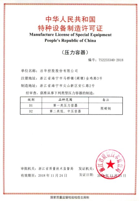 | 潔華控股日前取得D1\D2壓力容器制造許可證 |