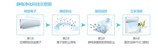 靜電除塵科技 超強污染吸附 美的空調(diào)通過不斷的技術(shù)研究開發(fā),率先打造靜電除塵工藝,實現(xiàn)污染物的有效吸附?照{(diào)本體通過自由離子的釋放,使得空氣中的粉塵荷電,最終通過空調(diào)體內(nèi)的靜電裝置吸附荷電粉塵,最終去除PM2.5顆粒,實現(xiàn)空氣凈化。