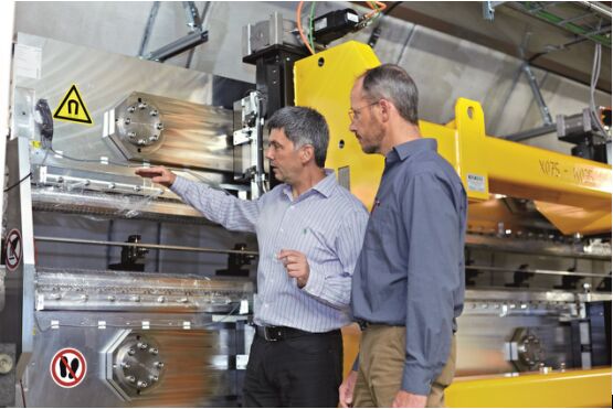 歐洲 XFEL 助理研究員 Suren Karabekyan 博士(左) 向來自倍福呂貝克分公司的 Nils Burandt 解釋波蕩器更細微的物理結(jié)構(gòu)細節(jié) 通過其像激光一樣的 X 射線線束,歐洲 X 射線自由電子激光裝置開辟了全新的研究領(lǐng)域,從而能夠?qū)崿F(xiàn)諸如納米三維圖像等功能,破譯病毒和細胞的原子結(jié)構(gòu)細節(jié),并檢查超快速的化學(xué)反應(yīng)。該設(shè)施總長為 3.4 公里,大部分位于地下隧道,并將由漢堡的歐洲 XFEL 研究機構(gòu)獨立運營。它將供來自世界各地的研究小組進行實驗研究。目前,已有十一個國家建設(shè)該裝置:丹麥、德國、法國、意大利、波蘭、俄羅斯、瑞典、瑞士、斯洛伐克、西班牙和匈牙利。 歐洲 X 射線自由電子激光裝置的特點是,在超導(dǎo)加速器技術(shù)的推動下每秒種 27,000 束 X 射線線束的超高重復(fù)率。線束的波長為 0.05 至 6 納米,其長度非常短,甚至可以看見原子結(jié)構(gòu)的細節(jié)。由于持續(xù)時間不到 100 飛秒(1 飛秒 = 10-15 秒),它甚至可以記錄分子或磁化反轉(zhuǎn)是如何形成的。激光的特性將使得在原子層三維成像成為可能。 被加速電子的 X 射線線束 X 射線線束形成的起始點是一個 1.7 公里長的超導(dǎo)線性電子加速器。電子束被加速到一個接近光速的高能量狀態(tài)。加速度在被稱為“諧振器”的特殊形狀的空腔中發(fā)生。這一切可以實現(xiàn)超導(dǎo),并衍射出 X 射線激光裝置所需的一束非常窄且均勻的電子束。 被加速的電子全速通過波蕩器 — 特殊的磁鐵組件,它強制粒子通過一個嚴密的回旋過程。電子發(fā)射出 X 射線,射線因為光與電子的交互而進一步放大。由于光的傳播速度比電子快,光“追趕并超過”粒子,并會在這一過程中對它們產(chǎn)生影響。其中一些電子被加速,另外一些則被減速,因此,這些電子構(gòu)成了大量薄盤。盤內(nèi)的所有電子現(xiàn)在同步輻射,產(chǎn)生超短、強烈的 X 射線線束,這些線束具有類似于激光的特性。 為了讓這個自放大自發(fā)輻射(SASE)的原理生效,波蕩器系統(tǒng)由多臺設(shè)備構(gòu)成,每臺設(shè)備都位于一個扇形陣列式加速器的后面。歐洲 X 射線自由電子激光裝置一開始將有 3 個波蕩器系統(tǒng) — SASE,1 和 2 各有 35 個 波蕩器單元,而 SASE 3 有 21 個單元。所有波蕩器系統(tǒng)加一起的總長度為 555.1 米。