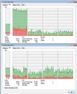 圖 4:CPU 負載;頂部:單個核上的顯卡負載,底部:所有四個核上分配的顯卡負載