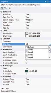 這里以 65 個通道為例,即使僅一小時內(nèi)產(chǎn)生的數(shù)據(jù)量就超過 3.8 GB,其中包括時間戳。有時并不需要以控制周期時間為采樣率記錄每一個過程記錄。驅(qū)動軸或加速度傳感器數(shù)據(jù)可能需要與周期相同的采樣率,但系統(tǒng)中的溫度傳感器并不一定需要。因此,在 Scope View 中,也可以為每個通道設置一個采樣率。例如,如果 40 個整數(shù)變量的采樣率從每秒鐘 1000 個值降低到每秒鐘才 1 個值,內(nèi)存的使用量也會減少為每小時 1.5 GB。 性能 復雜 Scope 配置的瓶頸本質(zhì)上在于極少的數(shù)據(jù)記錄。除了大數(shù)據(jù)量,主要挑戰(zhàn)在于以高采樣率顯示多個通道。關鍵參數(shù)是系統(tǒng)資源,如 CPU 性能、顯卡和內(nèi)存。然而,即使系統(tǒng)本身具有高性能,軟件也必須能夠有效地利用現(xiàn)有資源。TwinCAT 3 就是這樣一款軟件:在 TwinCAT 3 運行時中,能夠在不同的 CPU 核上以不同的周期時間執(zhí)行實時 PLC、NC、C++ 或 MATLAB®/Simulink® 任務。這樣,自動化軟件可以直接從PC技術(shù)中獲益,隨著CPU核數(shù)量的增加而提升更高的性能。Scope View 現(xiàn)在也能夠充分利用多核系統(tǒng),通過使用一個或多個 CPU 核來顯示信號。對于 Scope 配置內(nèi)的每個圖表,用戶都可以靈活選擇用于信號顯示的CPU核和處理性能。對于復雜圖表,例如 XY 圖中具有多個通道和軸,一個圖表可以使用多個 CPU 核。用戶可以在 Visual Studio® 的 Property 窗口(見圖 2)中選擇所選的圖表。