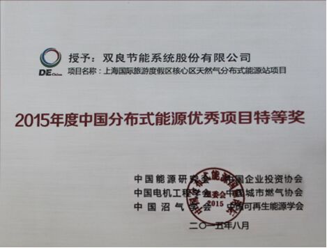 2015年:上海迪斯尼樂園項目,全球唯一使用分布式能源系統(tǒng)的迪斯尼樂園 榮獲2015年度中國分布式能源優(yōu)秀項目特等獎