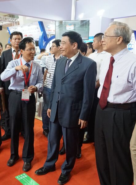 圖片注釋: 全國人大常委會原副委員長、兩院院士、中國機(jī)械工程學(xué)會榮譽(yù)理事長路甬祥(右),工業(yè)和信息化部苗圩部長(中),倍福中國區(qū)執(zhí)行董事、總經(jīng)理梁力強(qiáng)(左)