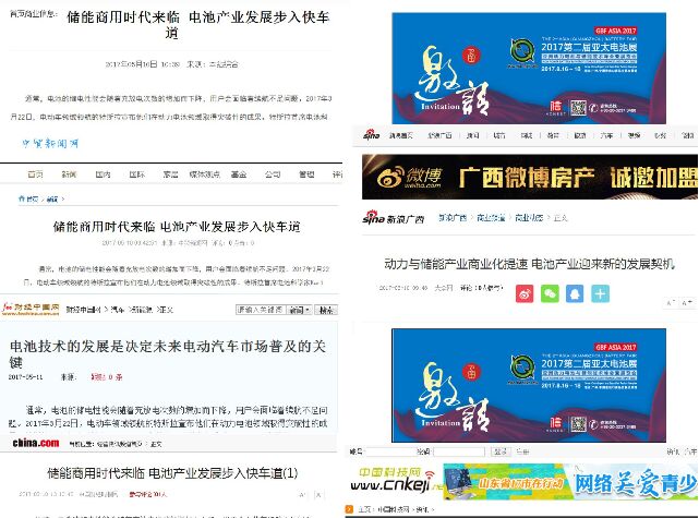 2017第二屆亞太電池展將于8月16-18日在廣州·中國進出口商品交易會展館A區(qū)隆重舉行,近日,人民網、廣東經濟網、廣東之窗、中國經濟網、中國日報網、深圳經濟網、京華網(京華時報)、中華網經濟頻道、中國新聞網、中國網科學頻道、中國日報網、中國貿易新聞網、中國科技網、中國財經時報網、亞洲網新聞、新浪廣西、新華網巴中頻道、騰訊汽車、搜狐媒體、汽車點評網、齊魯在線、京華網(京華時報)、環(huán)球汽車網、華訊財經網、廣佛都市網、莞訊網、東莞信息港財經、第一財經網、大洋網新聞、財經中國、新快網、網易、金羊網科技頻道、和訊河南頻道、廣州視窗、鳳凰網邵陽汽車、東方財富網、大公網財經頻道、21CN科技頻道、財經界等近50家知名媒體對其進行了報道。