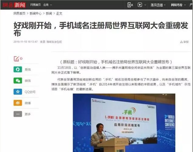 其實(shí),“.手機(jī)”注冊(cè)局作為亮相世界互聯(lián)網(wǎng)大會(huì)的“老司機(jī)”,已經(jīng)與世界互聯(lián)網(wǎng)大會(huì)幾度“邂逅”。 “.手機(jī)”亮相第三屆世界互聯(lián)網(wǎng)大會(huì) 在去年第三屆世界互聯(lián)網(wǎng)大會(huì)上,“.手機(jī)”注冊(cè)局全程驚艷亮相,在現(xiàn)場(chǎng)發(fā)布了以“進(jìn)入移動(dòng)互聯(lián) 啟用手機(jī)域名”為主題的“移動(dòng)互聯(lián)網(wǎng)+”普及活動(dòng),獲得與會(huì)領(lǐng)導(dǎo)和嘉賓的高度認(rèn)可和媒體的廣泛關(guān)注!