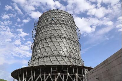 此塔采用蒙皮內(nèi)置結(jié)構(gòu)形式,即鋼構(gòu)件在外,蒙皮在內(nèi),此種形式在世界上也是首次應(yīng)用。這種結(jié)構(gòu)形式能把煙氣和鋼構(gòu)件完全隔離開,杜絕了煙氣對鋼構(gòu)件的腐蝕,保證了鋼塔在整個服役期間的安全性和穩(wěn)定性。 經(jīng)過大膽創(chuàng)新,精心設(shè)計,麟北發(fā)電廠建設(shè)的世界首例鋼結(jié)構(gòu)煙塔合一間冷塔,將成為中國火電建設(shè)史上又一工程典范。