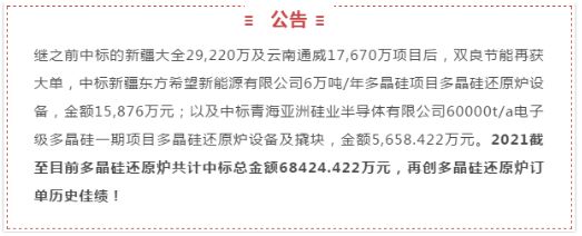 雙良節(jié)能的還原爐產(chǎn)品質(zhì)量、綜合指標(biāo)行業(yè)領(lǐng)先,根據(jù)之前公告的與云南通威、新疆大全的供貨合同,雙良節(jié)能將充分發(fā)揮在光伏多晶硅設(shè)備行業(yè)長(zhǎng)期積累的深厚技術(shù)實(shí)力和領(lǐng)先的生產(chǎn)能力,為促進(jìn)全國(guó)節(jié)能光伏產(chǎn)業(yè)和碳中和目標(biāo)貢獻(xiàn)自己的“智造”力量。