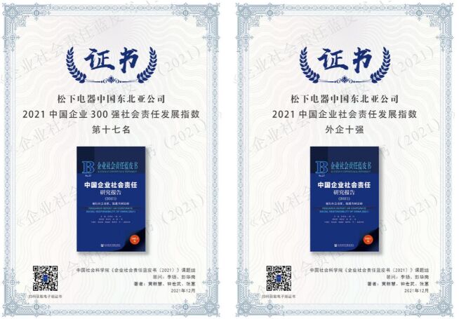 2021年12月3日,由中國(guó)社科院舉辦的“第十三屆《企業(yè)社會(huì)責(zé)任藍(lán)皮書(shū)》發(fā)布會(huì)”在京舉辦。在本次活動(dòng)中,發(fā)布了最新的中國(guó)企業(yè)300強(qiáng)(國(guó)企、民企、外企)社會(huì)責(zé)任發(fā)展指數(shù)排名,松下電器取得了總排名第17位,外企第3名的優(yōu)異評(píng)價(jià)。