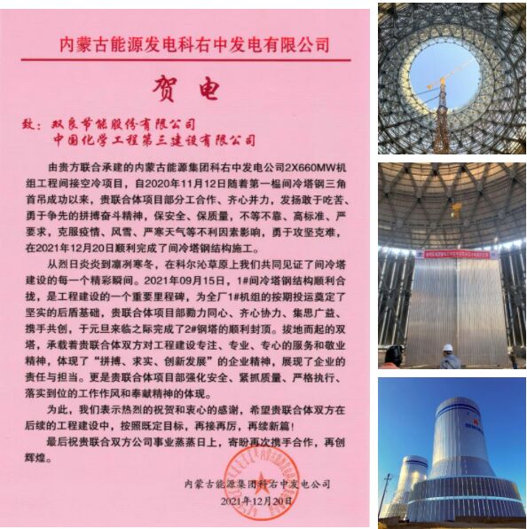 2021年,在內(nèi)蒙古這片草原熱土上,雙良為電廠建設(shè)的智能化大型鋼結(jié)構(gòu)間冷系統(tǒng)中,已有4座鋼結(jié)構(gòu)間冷塔順利完成了封頂合攏,分別是國電雙維上海廟電廠一期項(xiàng)目和蒙能集團(tuán)科右中發(fā)電廠項(xiàng)目。同時(shí)國電雙維上海廟電廠二期項(xiàng)目和國電建投長灘電廠項(xiàng)目的建設(shè)正在穩(wěn)步推進(jìn)中。在國家大氣污染防治和節(jié)能減排的發(fā)展戰(zhàn)略下,因?yàn)楣?jié)能節(jié)水環(huán)保的特性,采用鋼結(jié)構(gòu)間冷塔必將成為未來火電行業(yè)的潮流。雙良節(jié)能將一如既往秉持“弘揚(yáng)工匠精神,鑄造鐵軍團(tuán)隊(duì)”,為中國電力建設(shè)精品工程,為實(shí)現(xiàn)“碳中和”目標(biāo)貢獻(xiàn)力量。